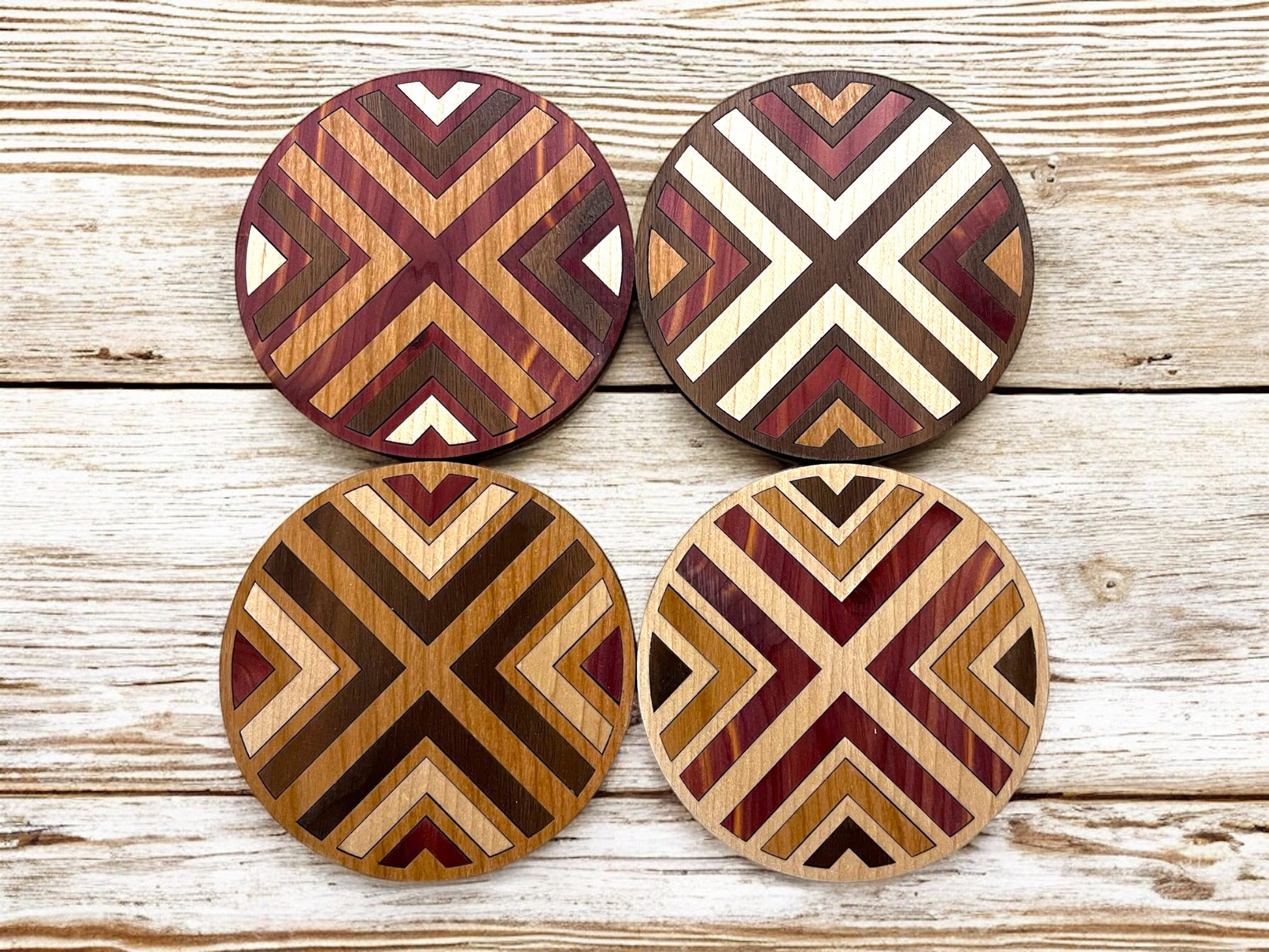 Hardwood Mosaic Coaster Set | Round Wooden Coasters with Cork Bottom | Design #4