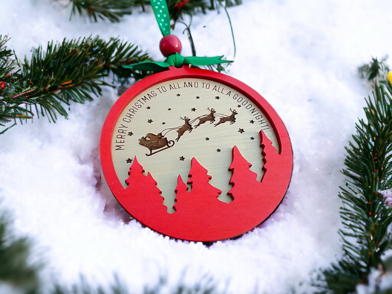 This charming wooden ornament features a delightful scene of Santa's sleigh and trees, perfect for adding a festive touch to your Christmas decorations. With the words "Merry Christmas to all and to all a goodnight" engraved on it, this ornament captures the joyful spirit of the holiday season. Hang it on your tree or use it as a decorative accent to create a warm and merry atmosphere in your home.