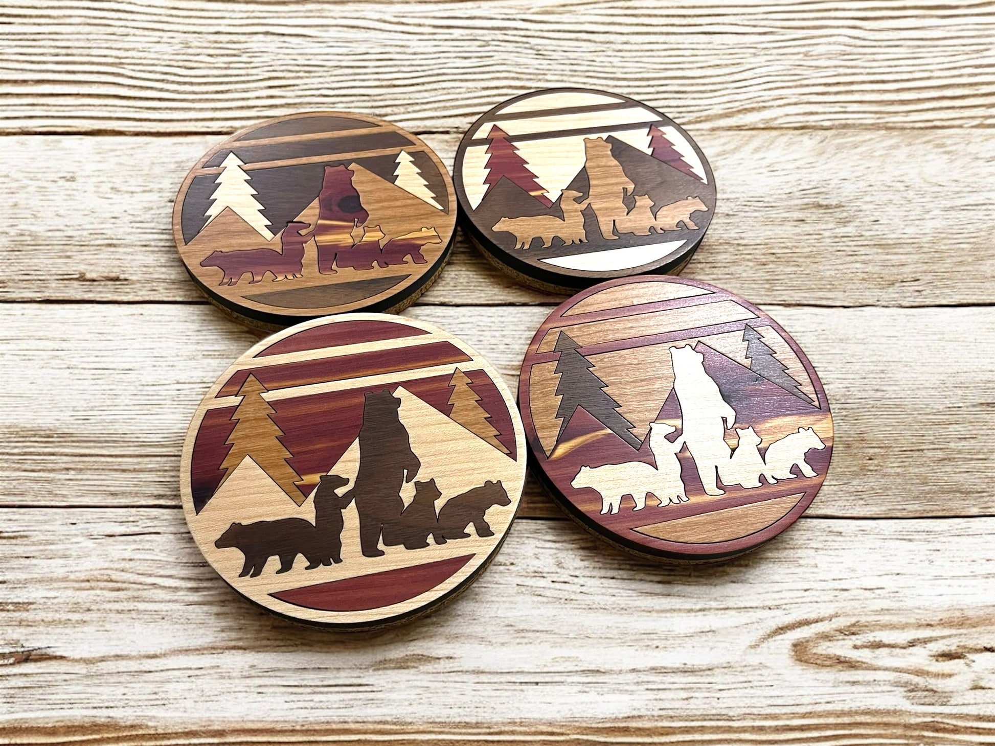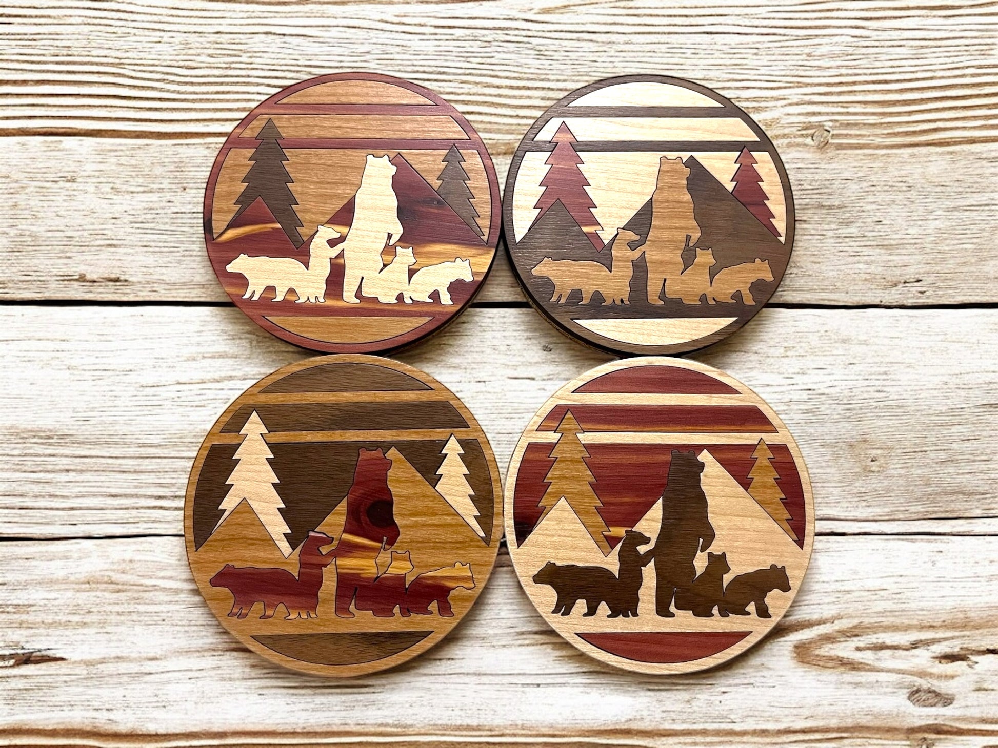 Hardwood Mosaic Coaster Set | Mountain and Bear with Cubs Round Wooden Coasters with Cork Bottom | Design #2