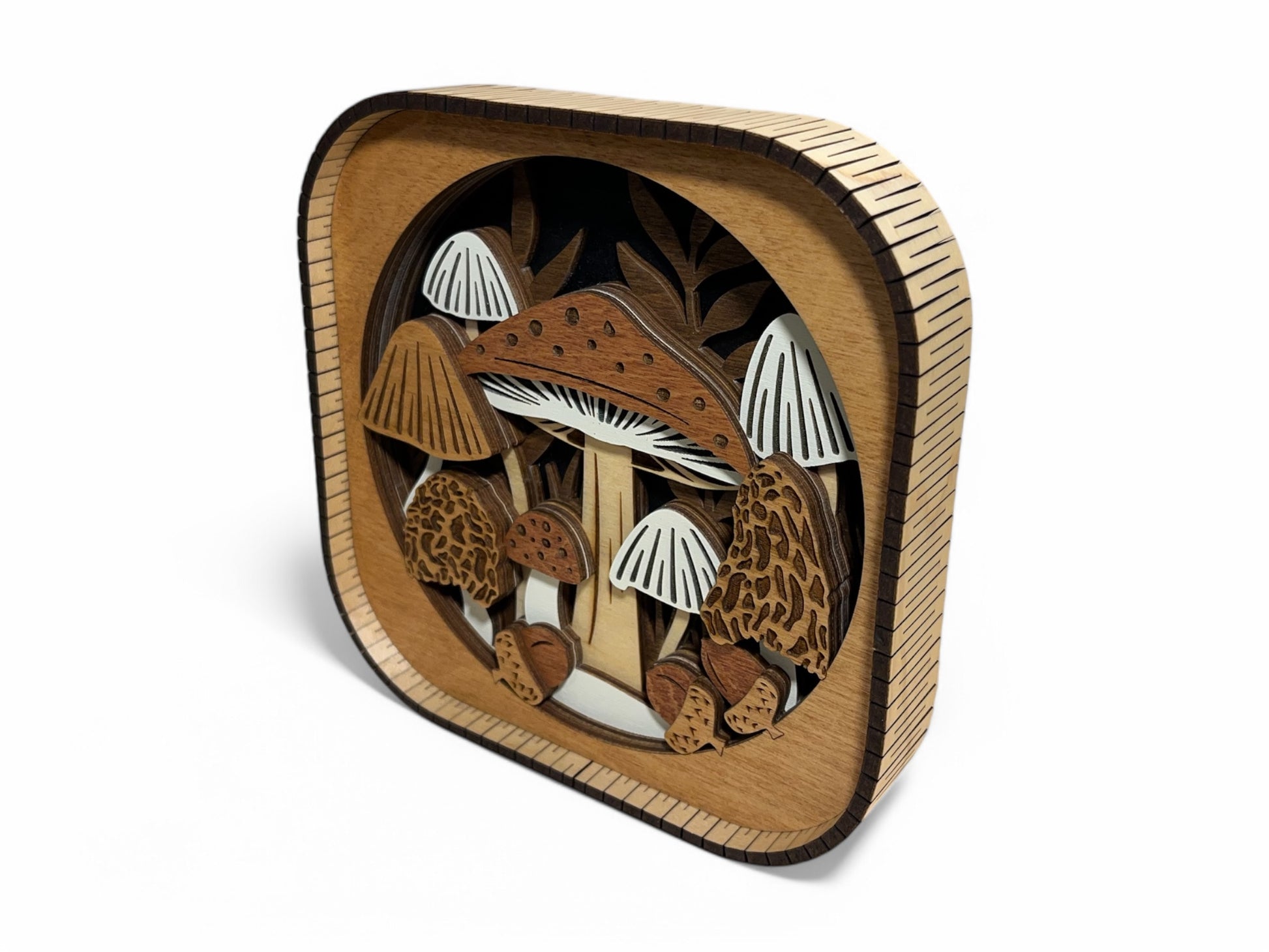 Add a touch of nature to your space with this handcrafted wooden shelf sitter featuring a detailed layered design of assorted mushrooms. Made from multiple tones of natural wood, this piece brings earthy charm and subtle woodland vibes to any shelf, mantel, or desk. A unique accent for nature lovers and rustic decor enthusiasts alike. Features a living hinge frame and measures about 6" x 6".