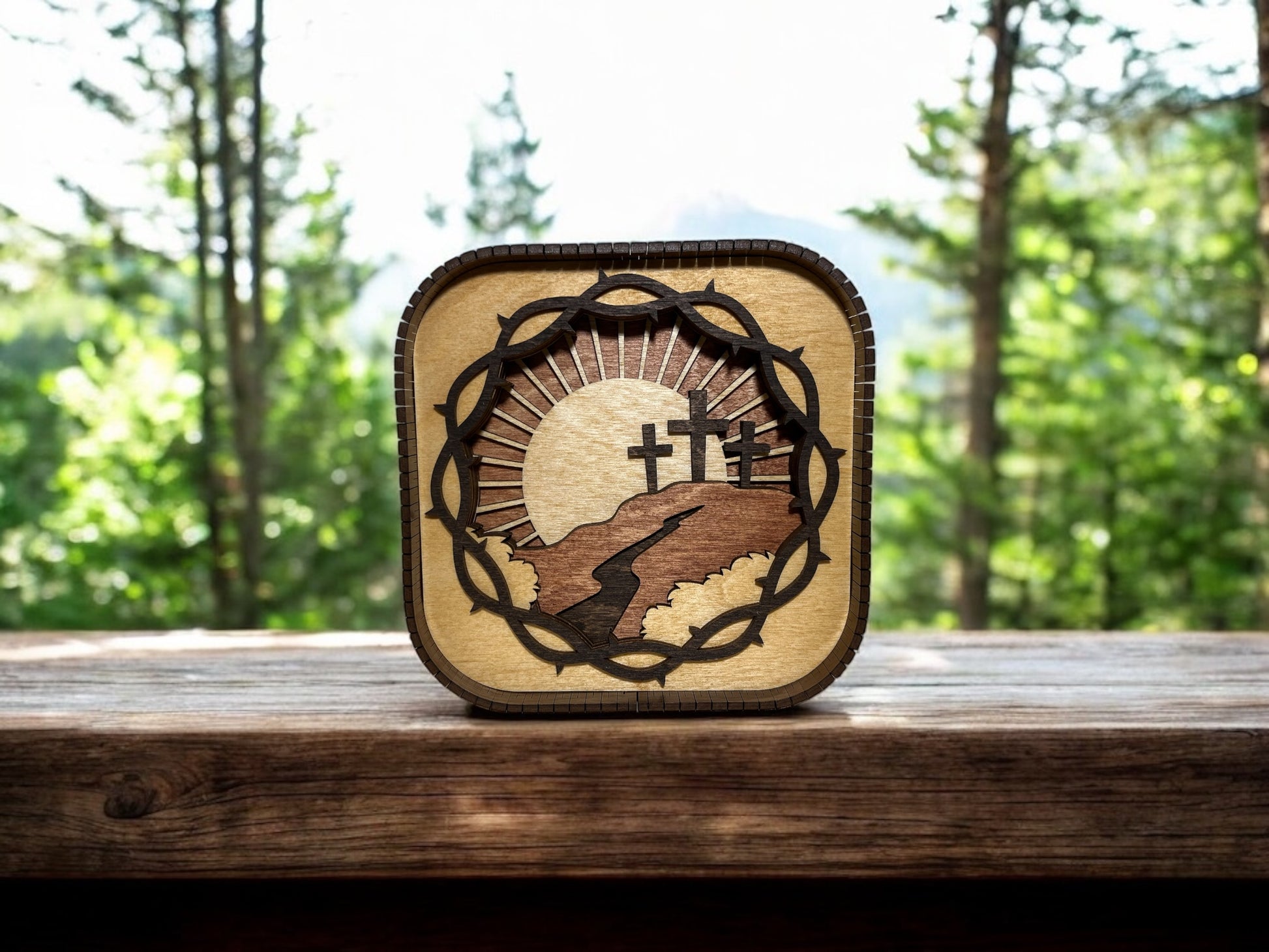 This beautifully crafted wooden shelf sitter features a layered design depicting three crosses on a hill at sunrise, symbolizing the crucifixion and resurrection of Jesus Christ. Surrounded by a crown of thorns, the piece blends natural wood tones with intricate laser-cut details, creating a powerful and inspiring Christian decor item perfect for Easter or year-round reflection. This piece features a living hinge frame. Measures about 6" x 6".