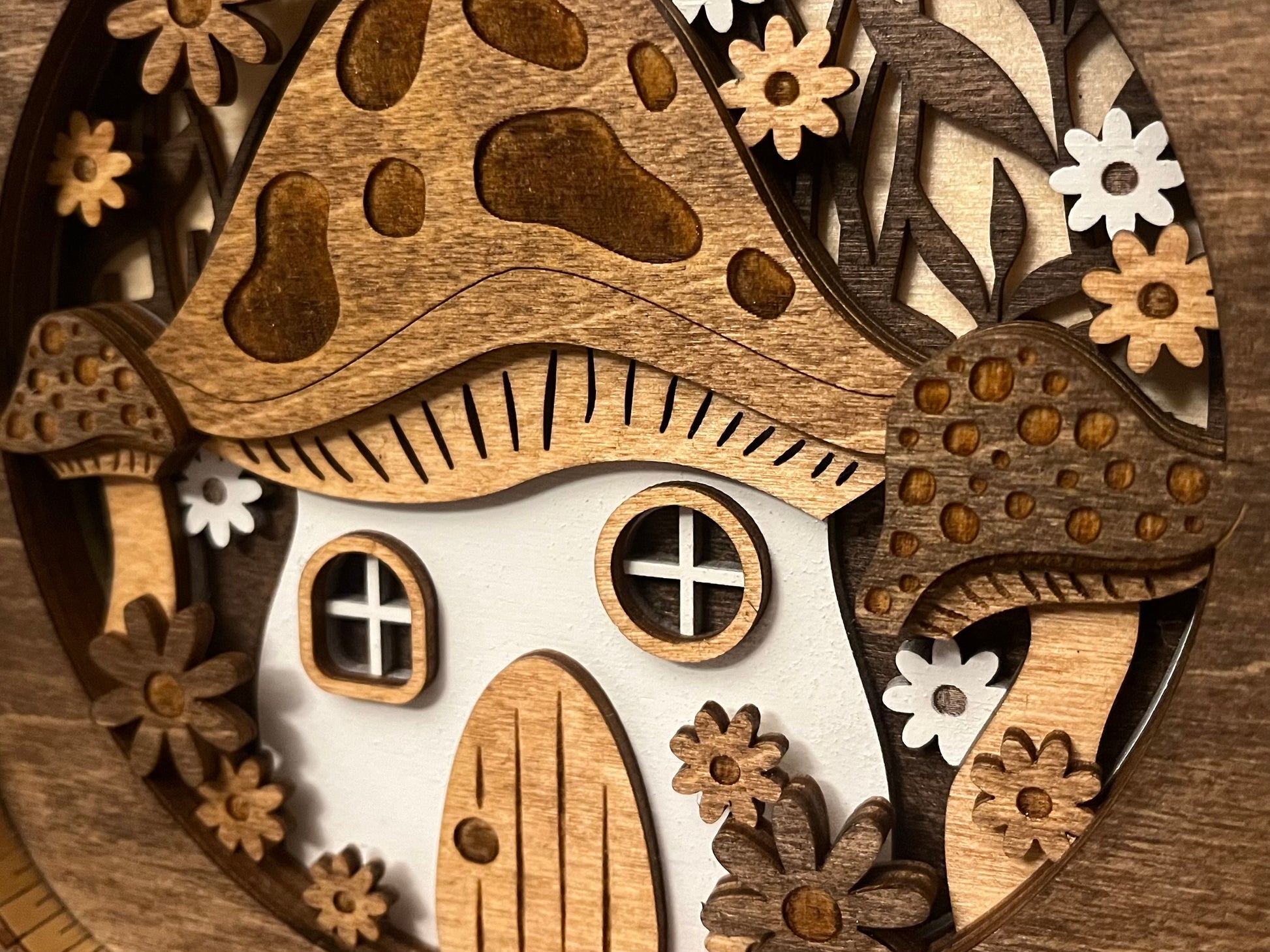 This charming, layered shelf sitter features a whimsical mushroom house. The intricate details and warm tones make it a perfect addition to a nature-inspired or fairy tale-themed decor. This piece is made from multiple layers of wood and features a living hinge frame. Measures about 6" x 6". Perfect size to display on a shelf or mantel.
