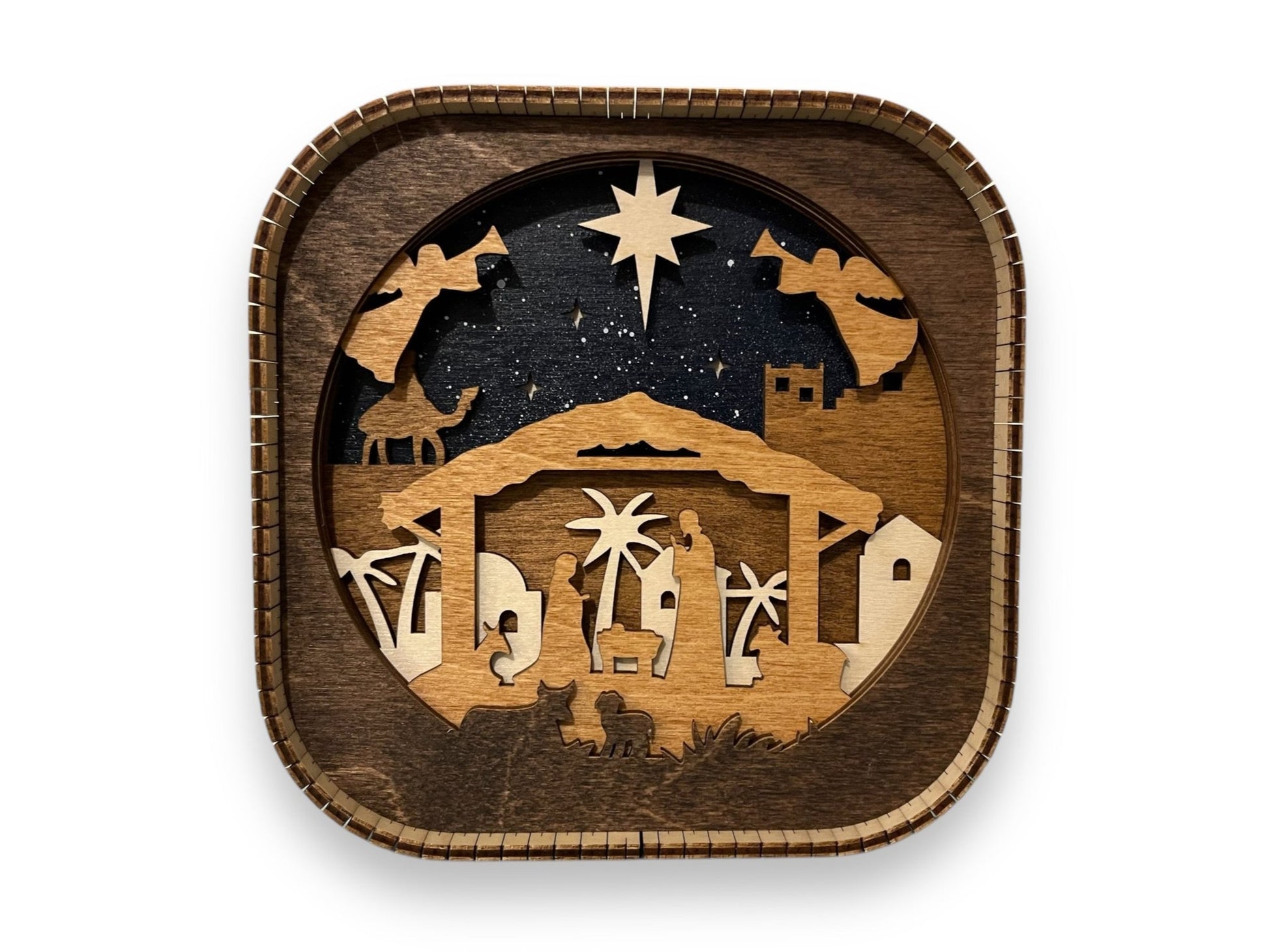 This unique, layered shelf sitter features the nativity scene. It would make a perfect addition to your Christmas decor, or it makes a great gift. This piece is made from multiple layers of wood and features a living hinge frame. Measures about 6" x 6". Perfect size to display on a shelf or mantel.