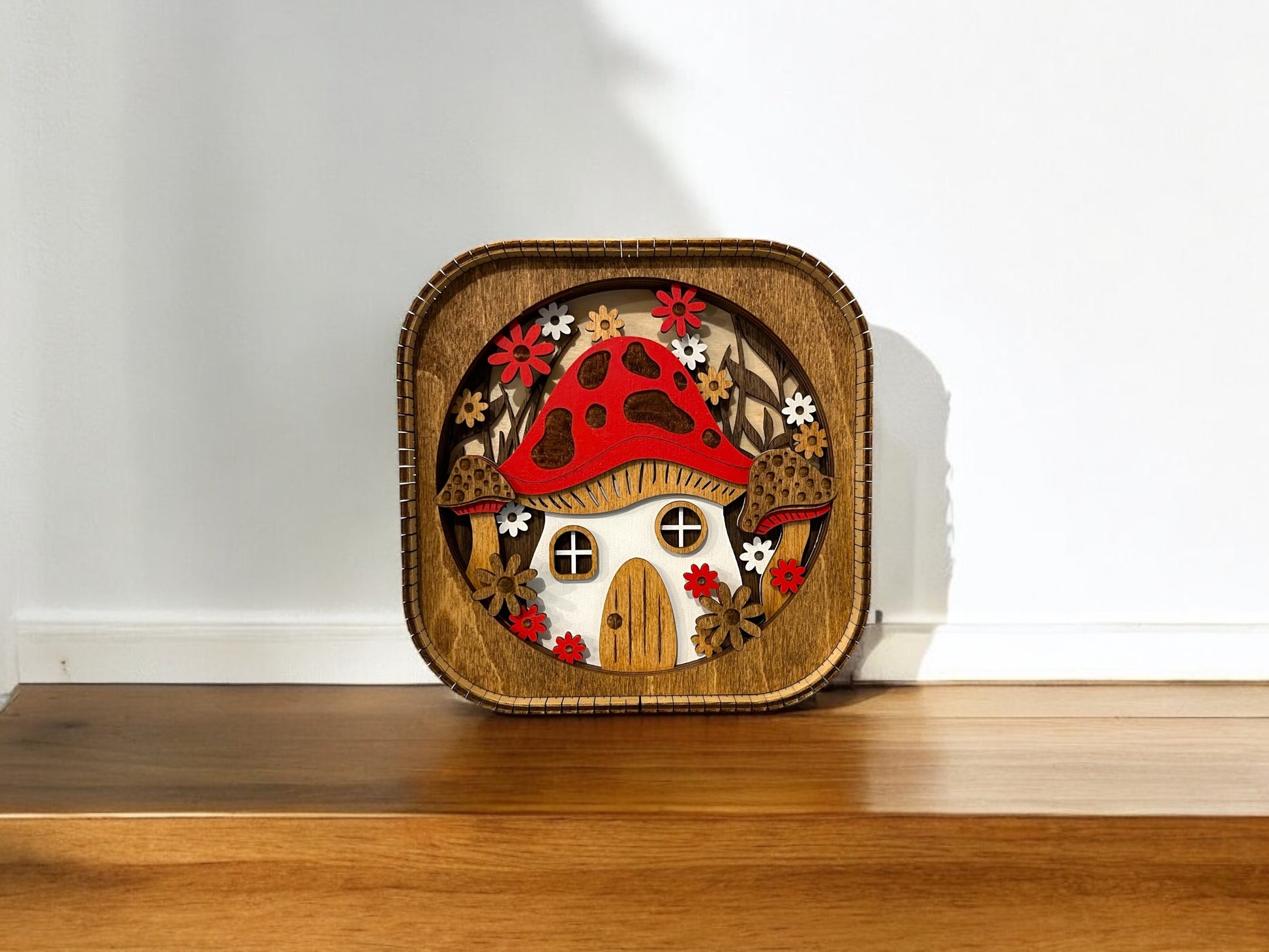 This charming, layered shelf sitter features a whimsical mushroom house. The intricate details and warm tones make it a perfect addition to a nature-inspired or fairy tale-themed decor. This piece is made from multiple layers of wood and features a living hinge frame. Measures about 6" x 6". Perfect size to display on a shelf or mantel.
