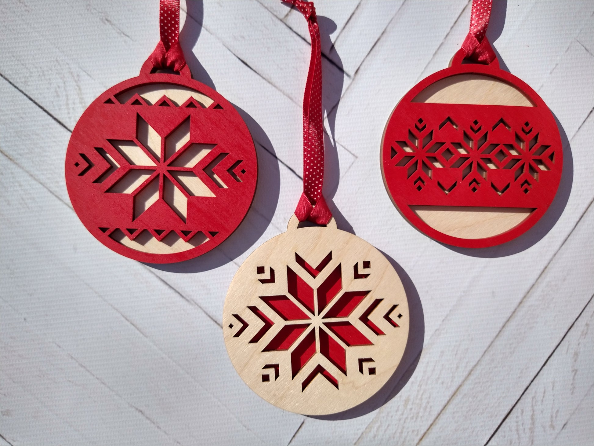 Set of 3 Red and Natural Wood Mosaic Christmas Ornaments